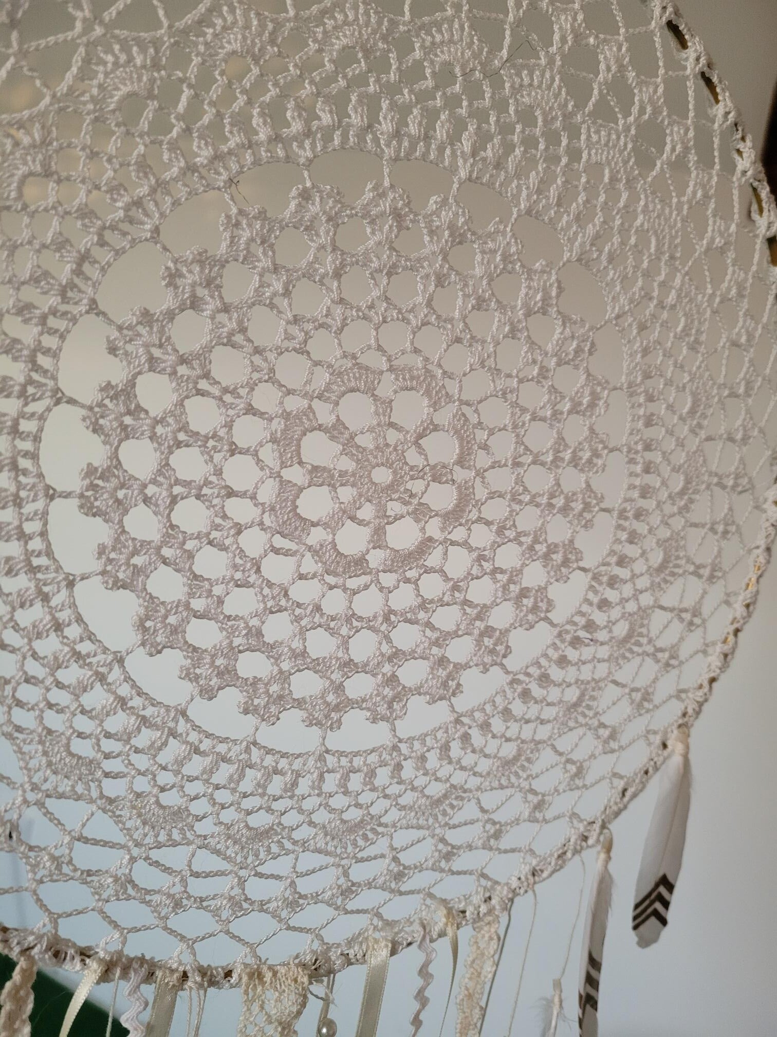 Collection les mandalas de Mamiline : Attrape Rêve élaboré à partir d'un "napperon" crée par une adorable mamie passionnée de crochet.
